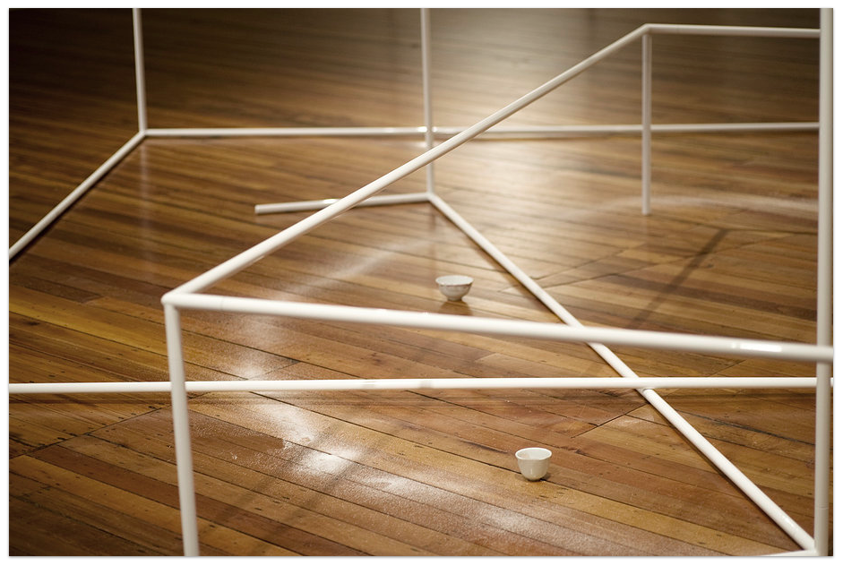 Here he refers in part to the rituals, usually not revealed to the public, performed by shamen, witches and other practitioners of the occult that are embedded into the production of his installations. Mitchell describes how this sets up a sometimes uneasy friction with his own strong minimalist aesthetic, in such works as Gateway to the Etheric Realm 2011. Here, within the crisp lines of the artist’s trademark barrier structures lies scattered the physical traces of the witch’s spell; “dragons blood, herbs, owls blood, blessed water and salt.” It is left to the viewer to feel out any traces of an encounter with the 4th dimension, and certainly here, as in the rest of Mitchell’s work, no clue is given as to the kind of invocation made, or what its intended effects on the viewer might be.